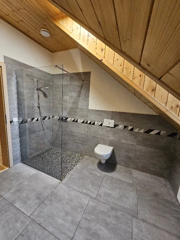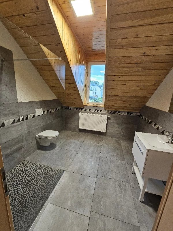 Une grande salle de bain avec douche à l'italienne et toilette.