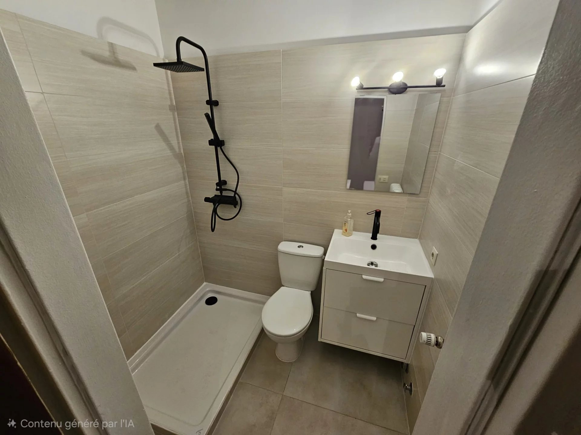 Studio se trouve côté jardin et se compose d'un petit hall, d'une pièce principale avec placard encastrai, une salle de douche toute neuve avec toilette et une petite kitchenette.