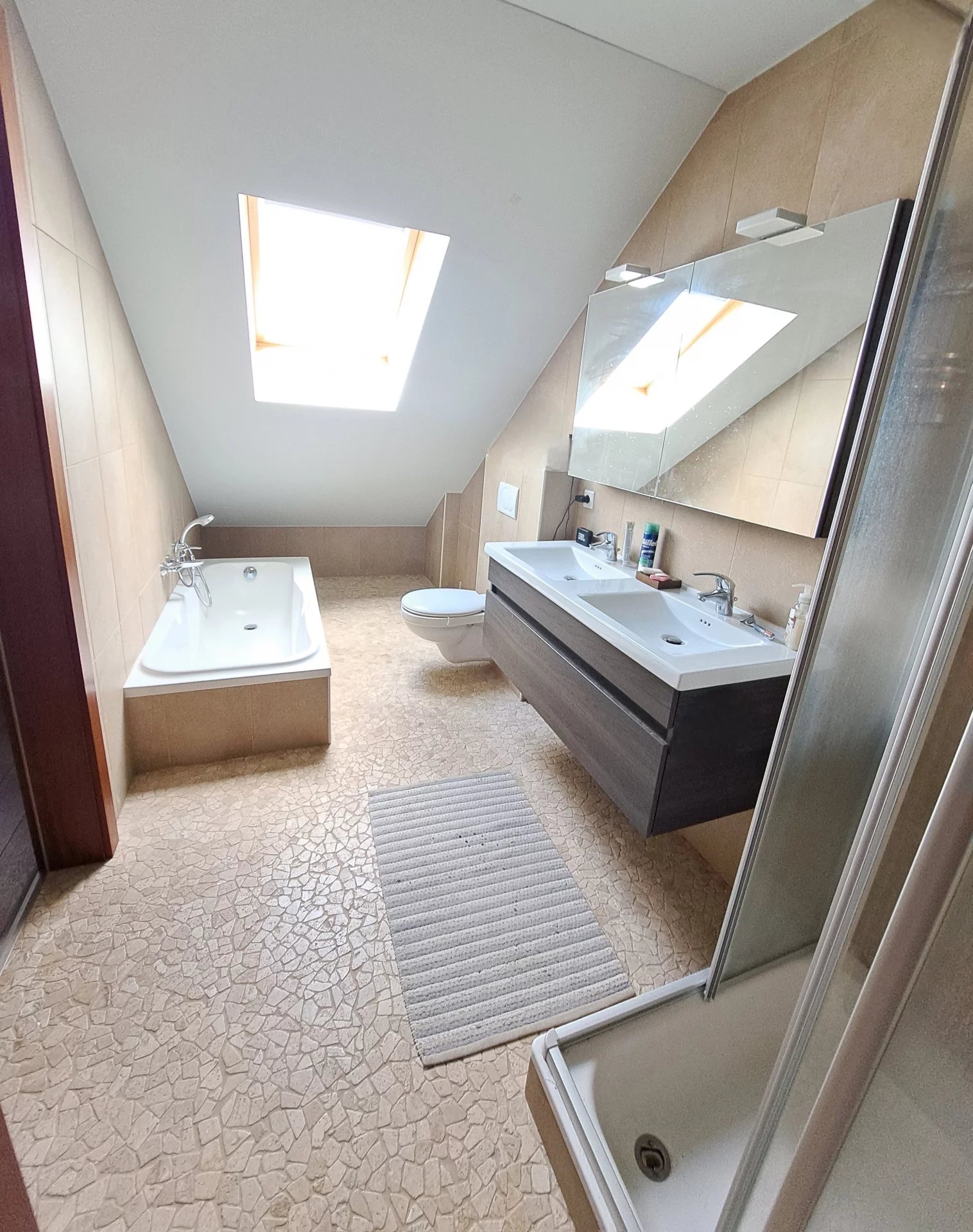 2ième étage: Pallier -2 chambres à coucher (+- 9,5m² et +- 16m²) - salle de bains avec douche, baignoire, double lavabo et toilette - une buanderie avec WC.